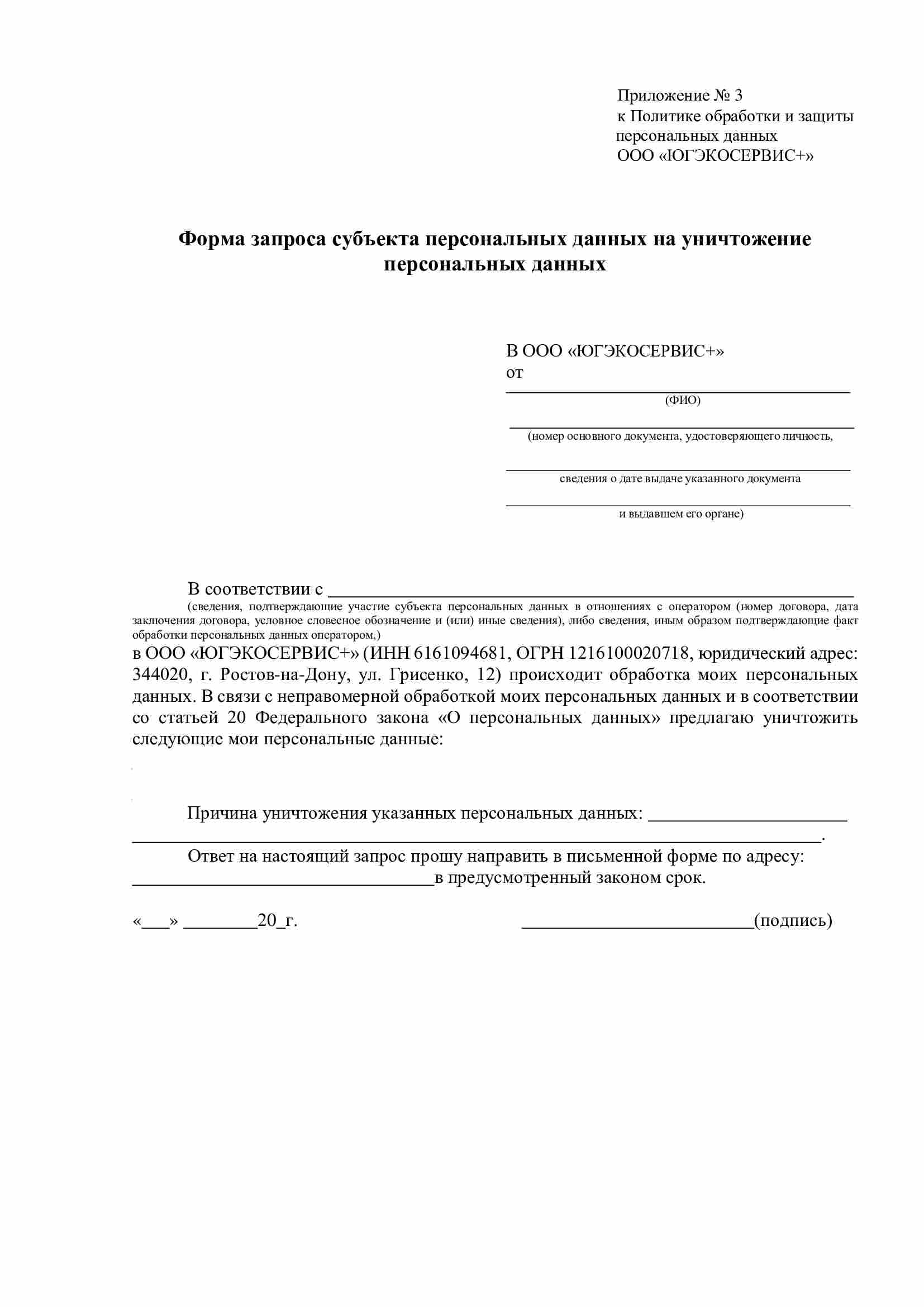 6.10. Для исключения неправомерности обработки персональных данных Субъекту (либо законному представителю) необходимо заполнить соответствующую форму запроса субъекта персональных данных на уничтожение персональных данных (приложение 3 или 7) и передать лично работникам ООО «ЮГЭКОСЕРВИС+», принимающим обращения граждан, либо по почте.