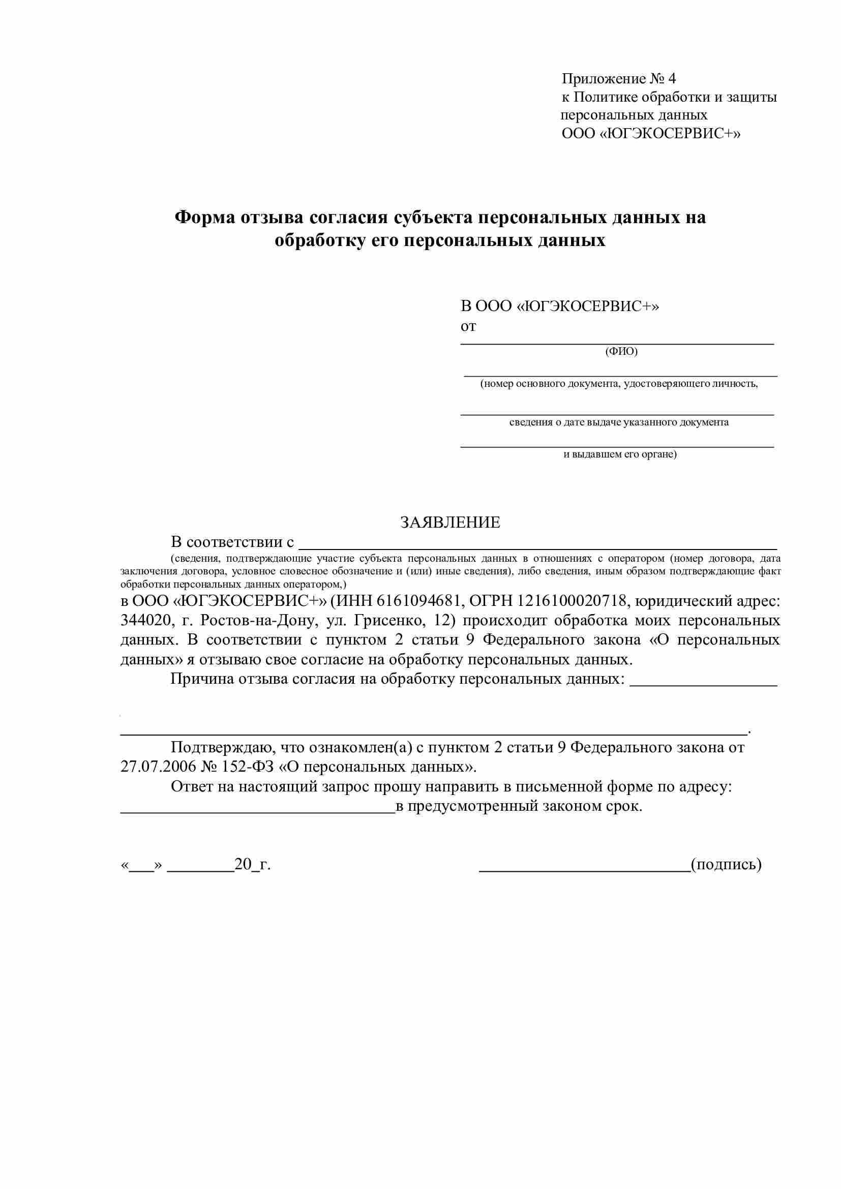 6.11. Для отзыва согласия Субъекта персональных данных на обработку его персональных данных субъекту (либо законному представителю) необходимо заполнить соответствующую форму отзыва согласия субъекта персональных данных на обработку его персональных данных (приложение 4 или 8) и передать лично работникам ООО «ЮГЭКОСЕРВИС+», принимающим обращения граждан, либо по почте. В случае отзыва согласия на обработку персональных данных ООО «ЮГЭКОСЕРВИС+» вправе продолжить обработку персональных данных без согласия субъекта персональных данных при наличии оснований, указанных в пунктах 2 - 11 части 1 статьи 6, части 2 статьи 10 и части 2 статьи 11 Федерального закона от 27.07.2006 № 152-ФЗ «О персональных данных».